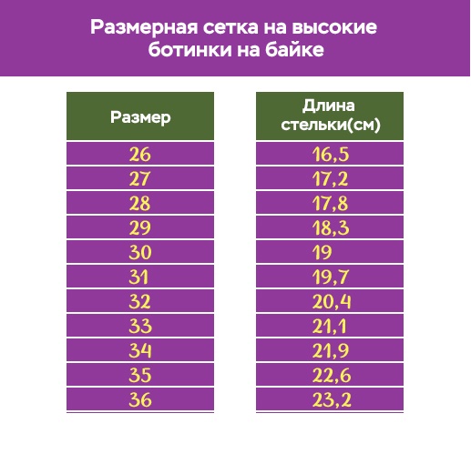 Данная модель ботинок выпускается с размерами от 26 до 36